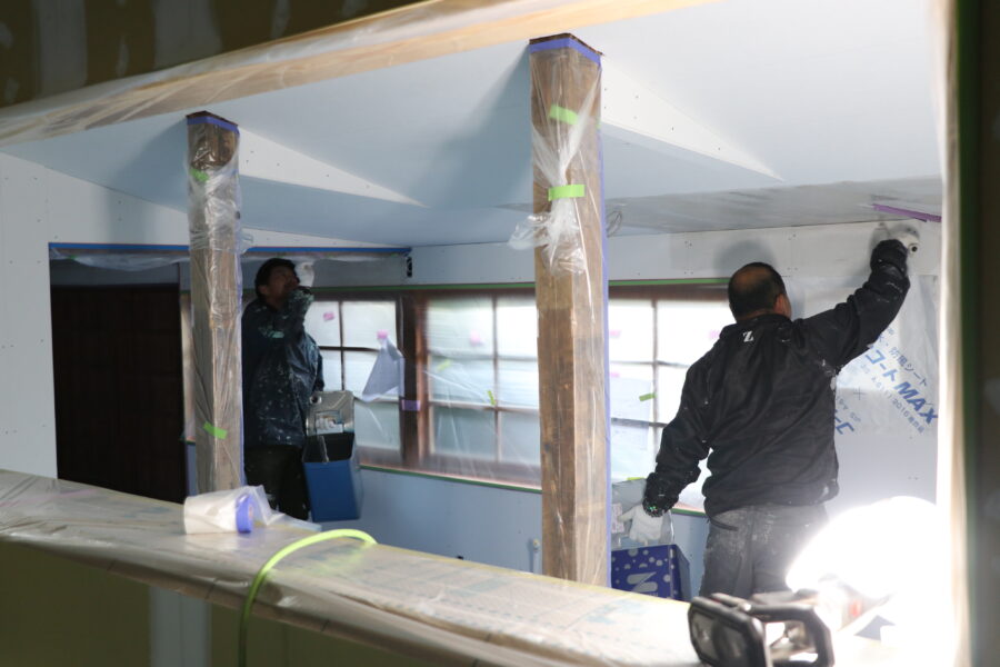 ↑塗装工事の様子。壁に漆喰(自然素材)を塗っていきます。