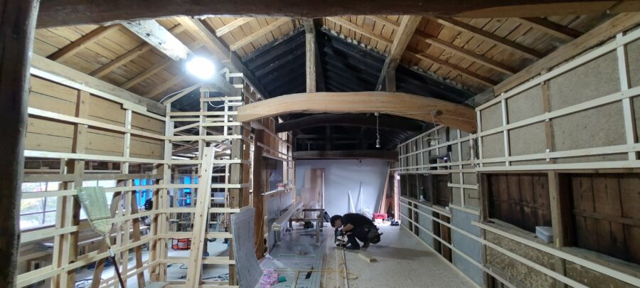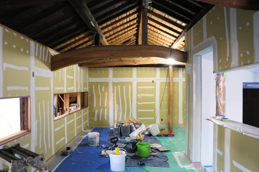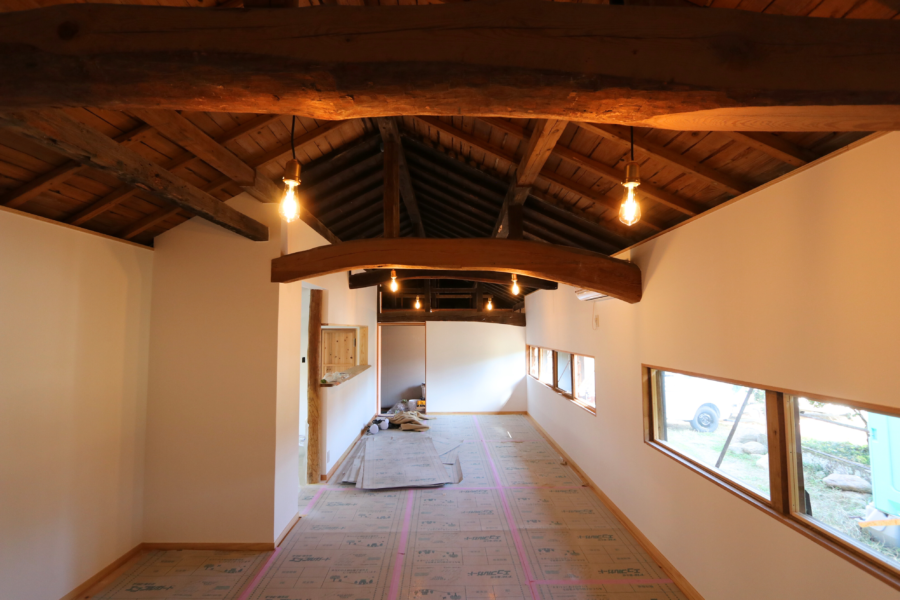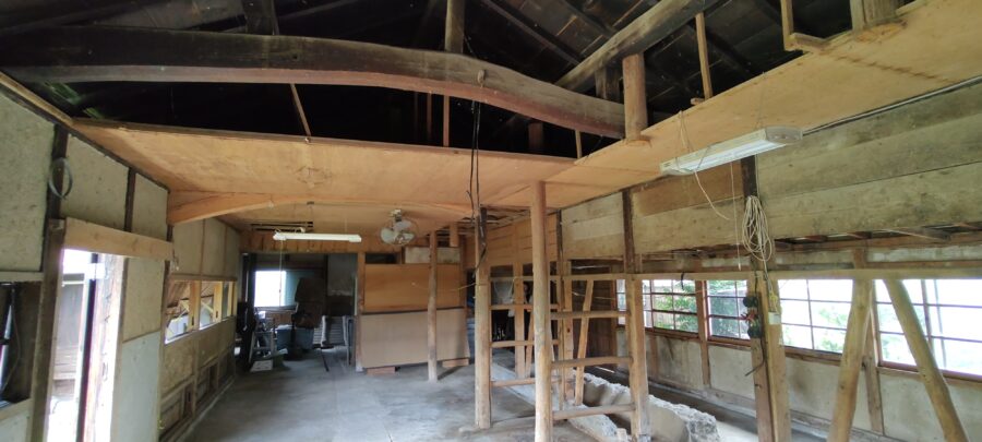 ↑解体の様子。天井付近にある太くて立派な梁はそのまま残しました。