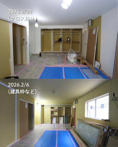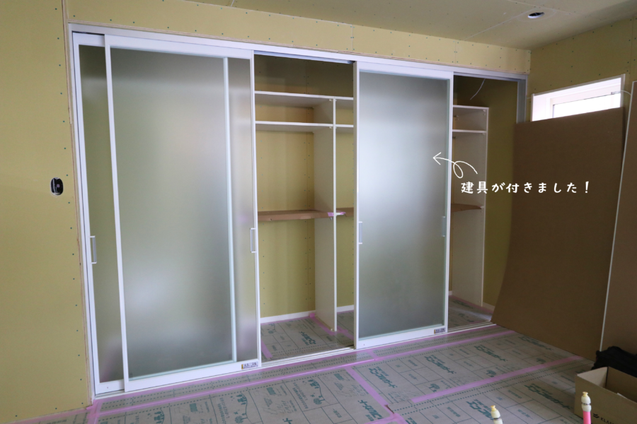 ↑前回はまだだった収納棚の中や建具にもクロスが貼られました。