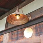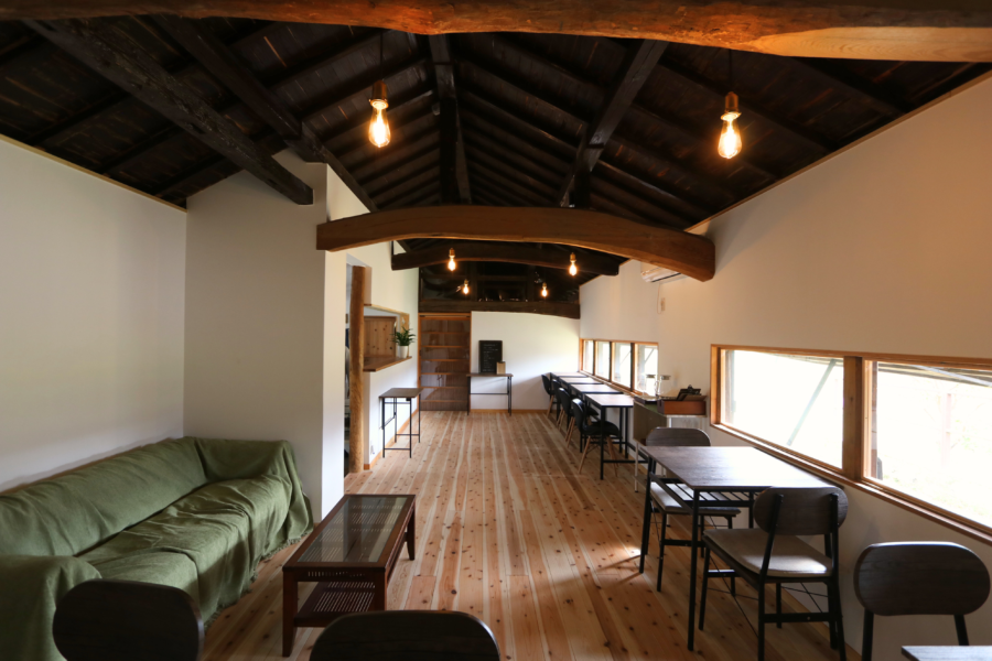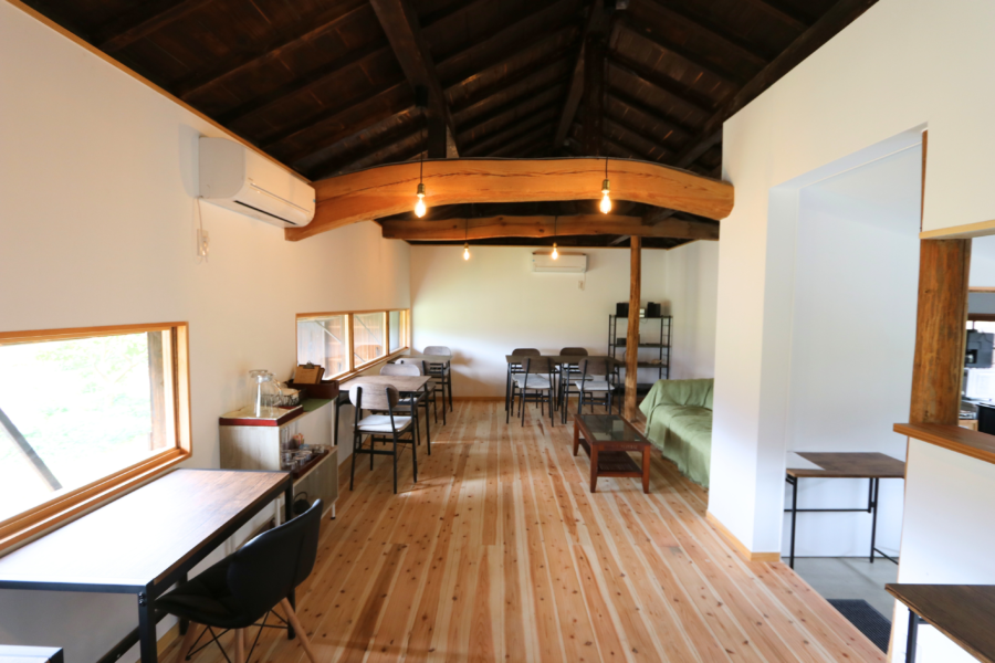 店内の様子。牛舎の時にあった立派な梁はそのまま使用しています。(床は無垢のスギです)。