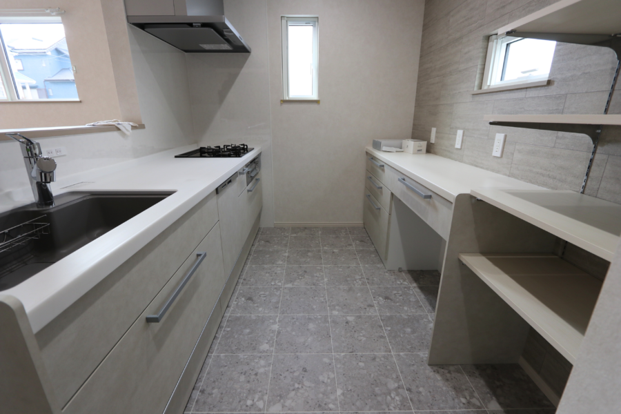 ↑カップボードも可動棚もシステムキッチンの色味に合わせています。