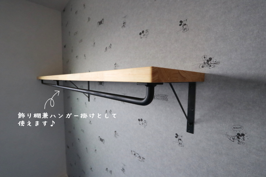飾り棚の下にアイアンバーもつけたので、ハンガー掛けとしても使えます。