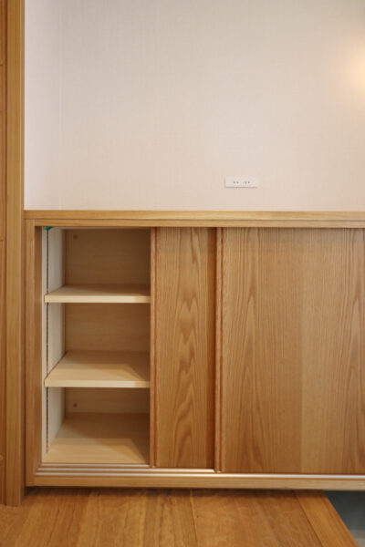 ↑フローリングは床暖房用の無垢のナラ材を使用しています。
