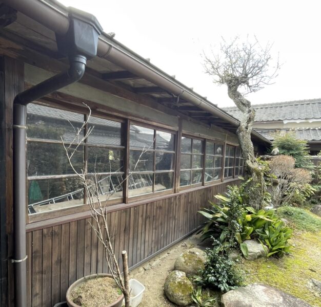 ↓裏はもともと上半分一面窓でしたが、リフォーム時に窓を減らし厨房の換気口を出す部分を設けました。(細長い窓はトイレの窓です。)
