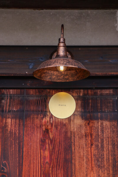 このアンティークな照明とまるい看板の組み合わせがおしゃれ。